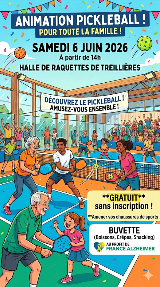 Animation Pickeball aura lieu le samedi 6 juin 2026 entre 14h et 17h à la halle de raquettes.